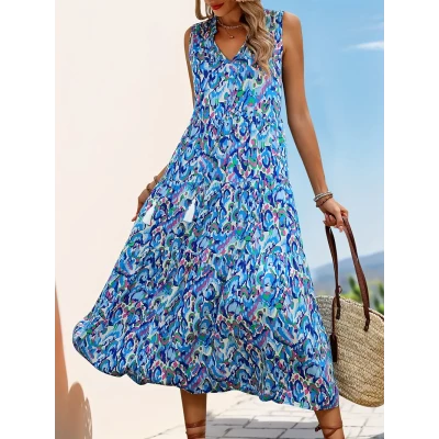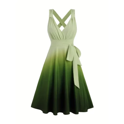 Elegant Sleeveless Gradient Color V Neck A-line Flowy Dress - Transitional Piece for Spring & Summer - Printed, Pleated, Tie Waist, Women's Clothing