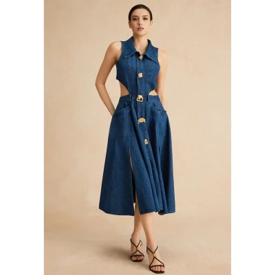 Women'S Stylish Sleeveless Denim Dress. Mid - Length Skirt With Waist Cut - Out And Slit Design, Embellished With Metal Buttons.