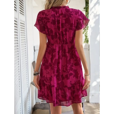 Women's Floral Print V-Neck Belted Dress with Ruffle Hem - Lightweight Aline Dress for Spring Summer Fall, Machine Washable Casual to Semi-Formal Wear, Flowy Casual Dresses, Vacation Outfit
