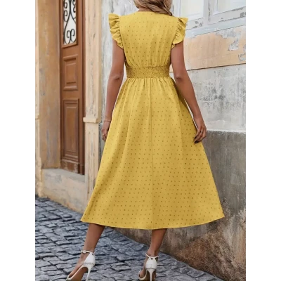 Vibrant Yellow Sleeveless V-Neck Midi Dress | Women's High Waist Ruffled Bohemian Summer Dress with Pockets, Machine Washable for Casual & Party Wear