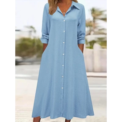 Long Sleeve A-line Midi Plain Color Button Front Shirt Dress for Spring & Fall, Women's Casual Clothing