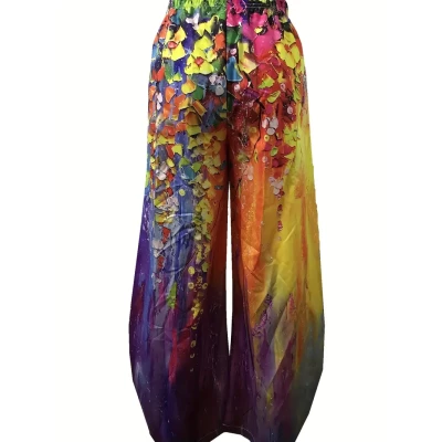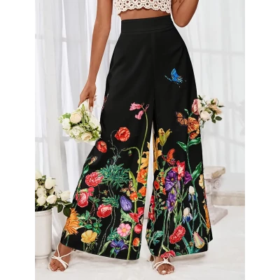 Vibrant Floral & Butterfly Print Wide-Leg Pants for Women - High-Waisted, Lightweight Polyester