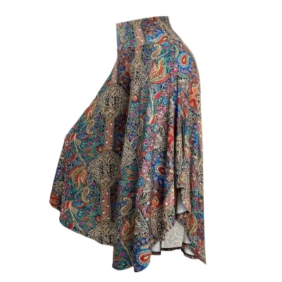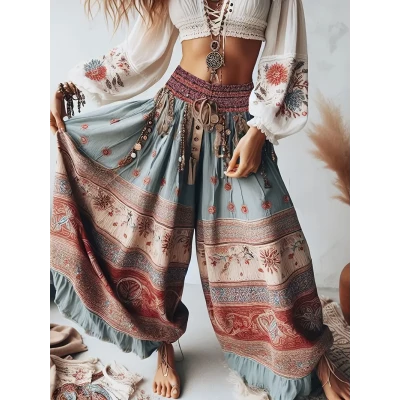 Lightweight Polyester Boho Chic High-Waist Wide Leg Ruffle Pants | Floral & Paisley Print