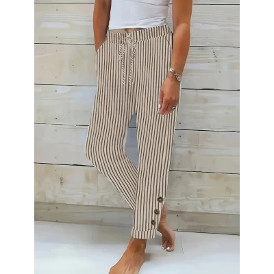 Women'S Casual Striped Cropped Pants with Buttoned Side Pockets