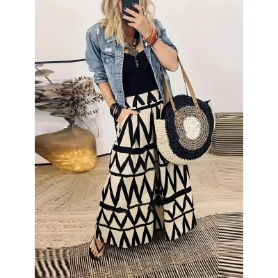Wide Leg High Waist Chevron Print Slant Pockets Pants, Vacation Style Versatile Pants For Spring & Summer, Women's Clothing