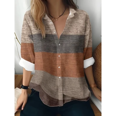 Women'S Casual Patchwork Lapel Collar Button- Shirt, 100% Polyester, Non-Stretch Woven Fabric, 120g/m², Spring/Fall Season