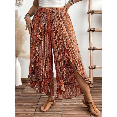 Women's Ethnic Print Ruffle Hem Wide-Leg Pants - Spring Summer Machine Washable Trousers with Non-Stretch Fabric