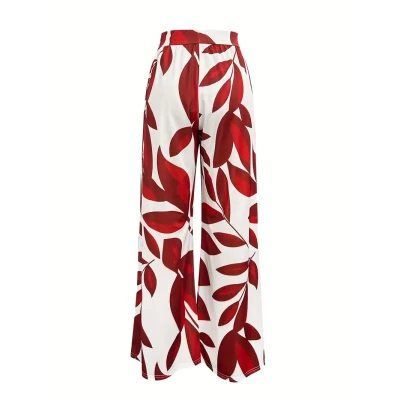 Women's Red & White Leaf Print Wide-Leg Pants - Stretchy Polyester-Spandex Blend, Loose Fit Machine-Washable Trousers for Spring/Fall Commuting & Casual Outings