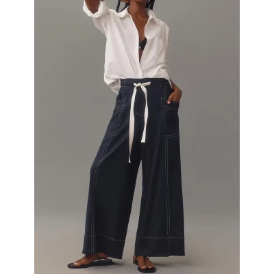 Women'S Elegant Wide-Leg Pants with Drawstring Waist - Comfortable Stretch Fabric, Side Pockets, Solid Color, Perfect for Business or Casual Wear