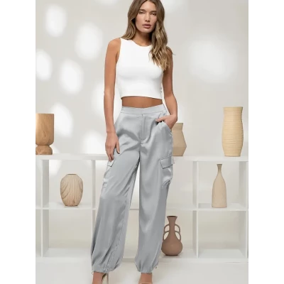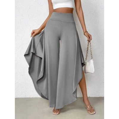 Elegant Gray Women's High-Waisted Asymmetrical Wide-Leg Pants | Flowy Design with Ruched Detail, Perfect for Spring/Fall, Stylish Adult Clothing