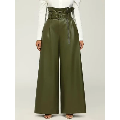 Women's High-Waisted Wide Leg Pants with Metallic Belt Detail - Elegant Solid Black, All-Season Fashion Trousers for Adults, Ladies Pants