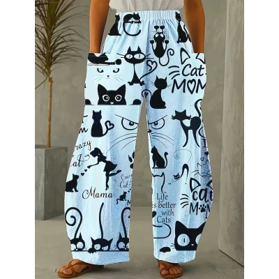 Cute Black Cat Straight Leg Pants Pocket Leisure Women Versatile Long Pants