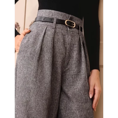 Women's High-Waisted Gray Straight-Leg Pants with Adjustable Belt - Middle Eastern-Inspired Retro Office Casual Trousers