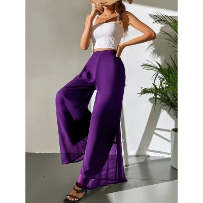 Elegant Black Wide-Leg Pants | Women's Flowy, All-Season Casual Style with Sheer Tulle Detail