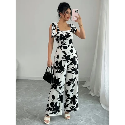 Women's Elegant Black & White Floral Print Jumpsuit - Off-Shoulder Semi-Sheer Wide-Leg Pants with Ruched Waist