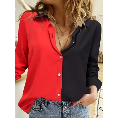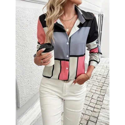 Color Block Button Front Shirt, Casual Long Sleeve Lapel Collar Shirt, Women's Clothing