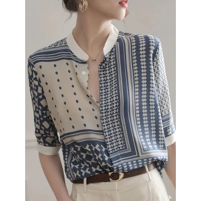 Elegant Geometric Print Button-Up Shirt with Stand Collar