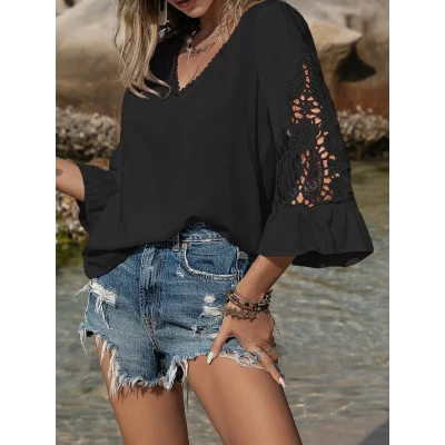 A Plain Casual Lace Patchwork Ruffled Sleeve Shirt, Perfect for Everyday Vacation Spots, Beach Parties in Spring And Summer, Women'S Clothing