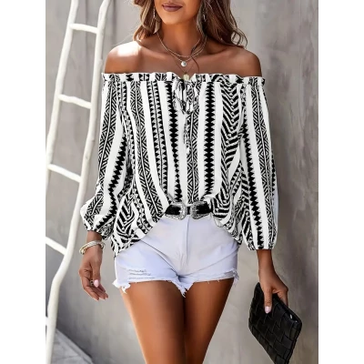For Spring & Fall, Elegant Off Shoulder Blouse with Geo Print, Lantern Sleeve, and Tie Front, Women's Clothing