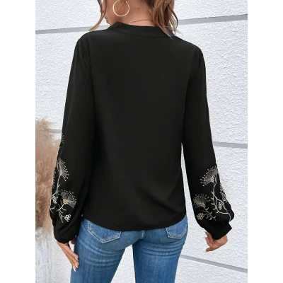 Elegant Embroidered V-Neck Long Sleeve Women's Blouse - Polyester Casual Pullover Shirt for All Seasons