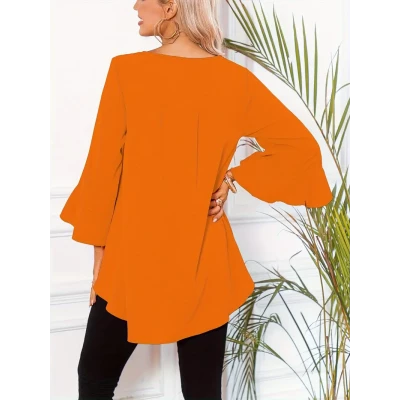 For Spring & Summer, Elegant Solid Color Crew Neck Blouse with Ruffle Sleeve, Women's Clothing