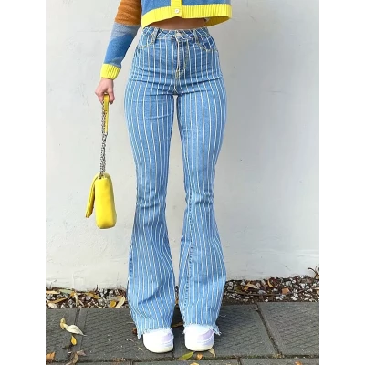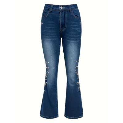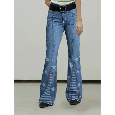 Women's Slim Leg Stretch Flare Jeans with Star Print & Net Splicing - Mid-Stretch Denim, Machine Washable, All-Season Casual Pants (Belt Not Included), Versatile Denim | Medium Elasticity